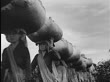 B/W 1920s/30s low angle line of workers carrying sacks on heads walking past camera in field - stock video