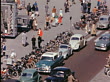 1950s high angle people, parked bicycles + traffic on city street / Netherlands - stock video