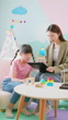 Vertical view of asian professional female children counselor working with a girl in a bright counseling room - she use brick during child psychotherapy