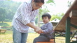 4K Video Medium shot of Asian Mother spraying, hand sanitizer to her son on the park bench