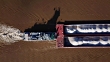 Direct overhead provides a dramatic contrast between brown water and white barge towboat on the Ohio River. Watch the propellers churn the brown water into white.