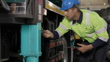 Engineers inspecting hydraulic system of a truck in industrial facility - 4K stock video