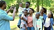 An African-American man taking a photo of his extended family with his mobile phone. Some of are making funny faces. The children are 3 to 12 years old and the adults are all in their 30s.