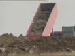 GV Lorry raising trailer to unload carcasses of sheep slaughtered in mass cull into grave
