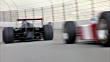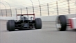 HAND HELD TRACKING A RED AND WHITE STRIPED FORMULA ONE RACE CAR RACING A BLACK RACE CAR WITH A RED STAR ON A RACE TRACK. SEE CLOUDS IN SKY AS CARS WEAVE BACK AND FORTH.
