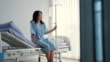 Young woman sitting on hospital bed looking out the window. Frustrated sad patient in ward alone.