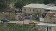 A static, close-up shot capturing a small, unpaved residential street within a settlement on the outskirts of Baku, Azerbaijan. The scene is defined by stone-and-concrete houses with cinderblock walls and corrugated metal roofs. A prominent feature is a clothesline strung between buildings, displaying freshly washed clothes and indicating daily community life. Two older model cars—a dark sedan and a distinct yellow hatchback—are visible on the unpaved road. The surrounding environment includes rough stone fences and patches of green, illustrating a low-income or developing urban reality.