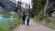 Mother and Son Walking on Lake Louise Lakeshore Trail in the Morning, Alberta, Canada - 4K stock video