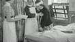 1940 MONTAGE Patient walking with crutches accompanied by nurse through filled hospital ward, doctors and nurse meeting with children outside hospital steps, and recovering servicemen sitting on bench with one holding a toddler / United Kingdom - HD stock video