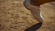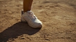 Close up of woman's sneakers as she pivots and shuffles across the frame, with long shadows