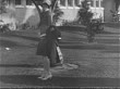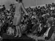 MOT 1920s: VACATION FASHION: HA WS Square runway & pavilion w/ people seated outside, models modeling dresses, VS Drop-waist dresses, model in winter dress w/ white fox boa wrap, models in beach attire, model in loose fitting top w/ wide-leg pants.