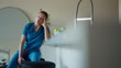 A nurse in blue scrubs leans on a kitchen stool, resting her head on her hand in a modern kitchen. The scene portrays exhaustion and a quiet moment of relief, emphasizing the demanding nature of healthcare work and the need for self-care.