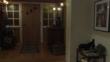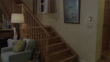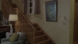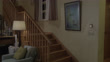 WIDE ANGLE OF LIVING ROOM AND FRONT ENTRANCE. FRONT WOOD DOOR AND WINDOWS. PAN RIGHT TO LEFT TO SHOW ROOM AND WOODEN STAIRS LEADING UP. MIDDLE CLASS SUBURBAN HOME. PAINTINGS ON WALLS, CHAIR, LAMPS.