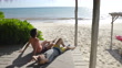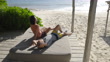Wide shot of gay couple relaxing in cabana on beach at tropical resort - 4K stock video