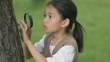 A young girl examines a tree trunk with a magnifying glass during her outdoor adventure.