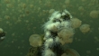 Golden jellyfish (Mastigias) trapped by anemones in lagoon, Palau - HD stock video
