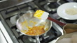 Hand of woman preparing yellow food using turner and aluminum pan in the kitchen of restaurant. Highly skilled woman with gloves preparing food in pan on the gas stoves burner. - 4K stock video