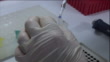 A laboratory technician's hand uses a pipette to transfer fluids between small vials.