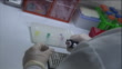 A laboratory technician's hand uses a pipette to transfer fluids between small vials. - HD stock video