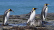 MS line of King Penguins walking past watching Southern Fur Seal lying on rock - 4K stock video