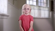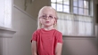 Low angle dolly shot push in on a little blond girl with glasses waring a red t-shirt standing in a hallway with windows on her right and behind her over her left shoulder.