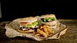 Slow motion dolly shot of man's hand taking crispy potato wedges laying next to two double delicious hamburgers on a table. Also available in 8K resolution.