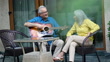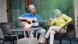 Senior man having fun playing guitar with his wife at home