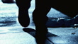 CU Man's feet walk down dark, wet alleyway - 4K stock video