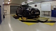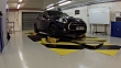 Mini car having its suspension tested. Footage of a Mini being tested after being assembled at a car factory. This test measures how responsive the car's suspension is by simulating a drive over rough terrain. This model of car is part of the Mini marque, manufactured by BMW. Photographed in the UK.