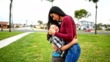 mother embrace the son in a public park