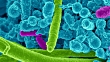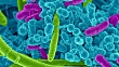 Oral bacteria. Animated coloured scanning electron micrograph (SEM) of mixed oral bacteria, consisting mostly of rod-shaped bacteria (bacilli) and filamentous bacteria.