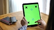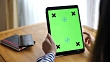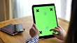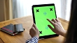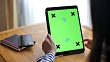 Over shoulder shot of sliding and using digital tablet, Green screen