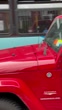 Red Jeep car near sidewalk has person wearing a scary white clown mask staring out the back window as traffic and other cars pass by (Footage by Collab via Getty Images UGC)