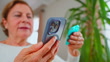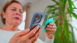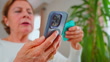 Senior woman using AI chatbot on smartphone while holding medication blister pack — healthcare technology and remote assistance concept - 4K stock video