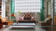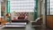 Slow motion video of unoccupied living room with sofa, armchairs, coffee table, book shelves, and dining room table in foreground.