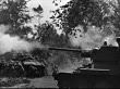 1942: EASTERN FRONT: TD WS Soviet Union Red Army infantry soldiers walking up winding hill road. Soviet soldiers riding on T-34 medium tank. WS Tanks & soldiers into exploding clearing, soldiers jumping off tanks running into battle, trees burning BG.