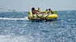 Summer fun.Four friends enjoying an inflatable tube ride at sea