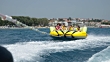 Summer fun.Four friends enjoying an inflatable tube ride at sea