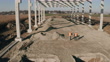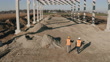 Drone shot of two construction workers checking a construction frame of a building under construction.