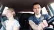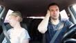 Young driver feeling sleepy and tired after long road trip. Drowsy couple inside the car