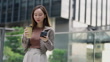 A young woman sipping coffee while using her smartphone outside a modern office building. The image conveys a sense of urban lifestyle, convenience, and multitasking.